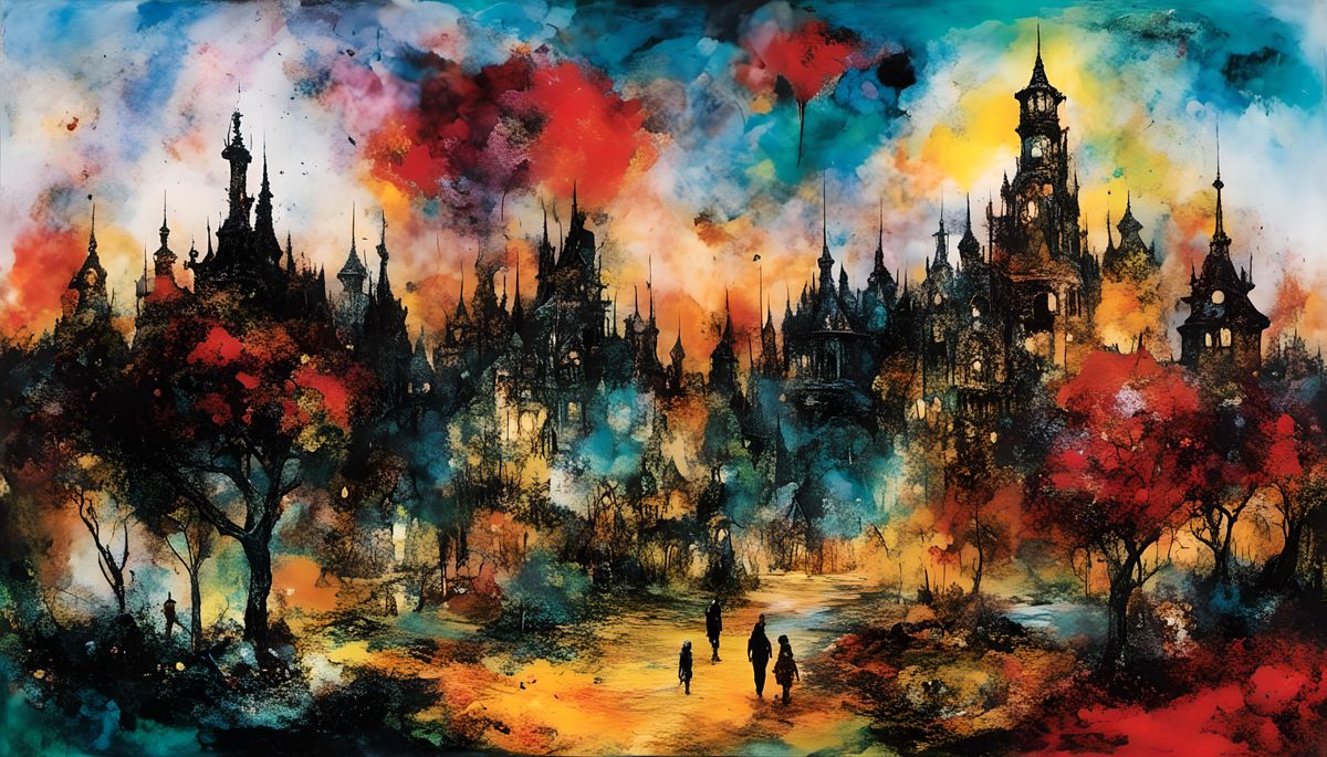 This image shows a group of vampire orphans as stowaways. The artwork is reminiscent of 2D pixel art with alcohol ink techniques, creating a dark fantasy with film noir elements.