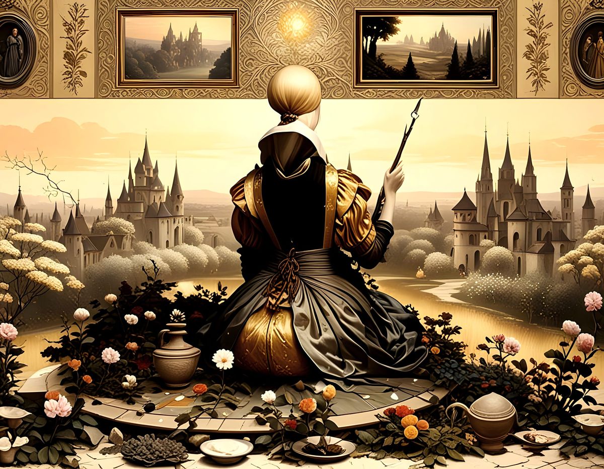 This image shows a highly detailed and colorful painting in the Renaissance style. The artwork has a surreal quality, blending traditional techniques with imaginative elements.