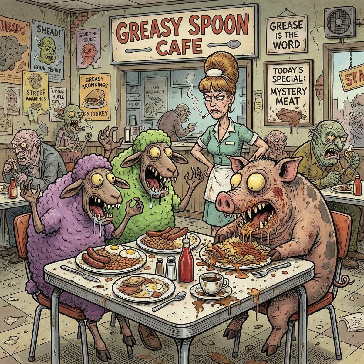 This image shows characters from reference images dining at a Greasy Spoon Cafe, rendered in a humorous, colorful style with extensive background detail.