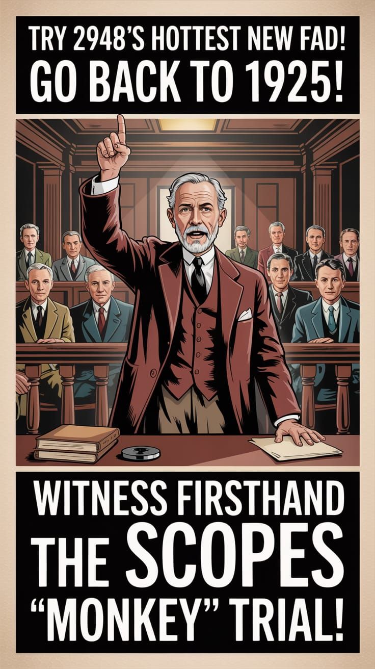 A 1950’s style Travel Poster advertising the Scopes “Monkey Trial”. The image shows a 1920’s courtroom, full of older men. Standing at the front, between the Judge’s bench and the Defedant’s table is a distinguished looking older man with a beard, wearing an old fashioned 3 piece suit. His mouth is ...