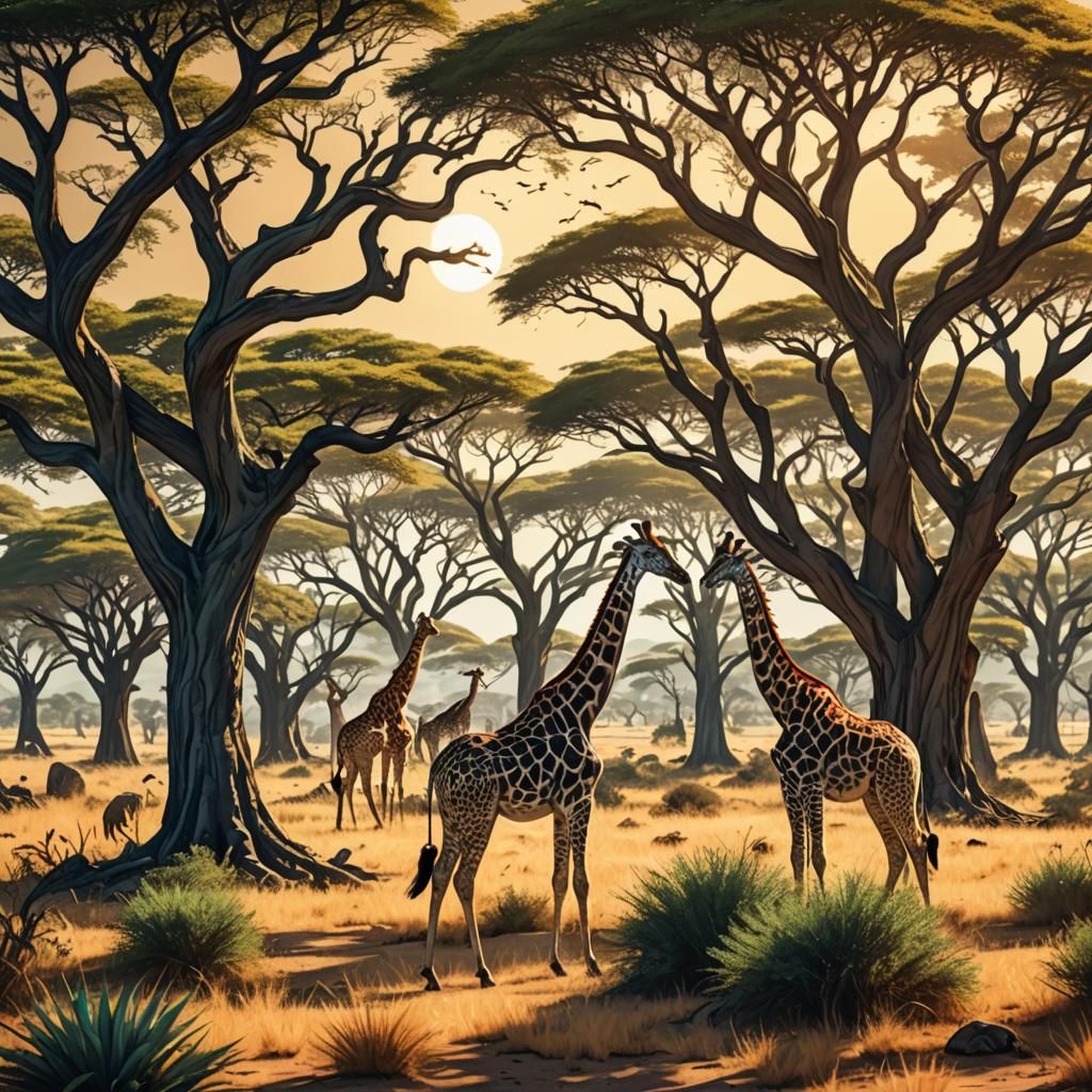 A vivid image of an African savannah filled with acacia trees and giraffes bathed in midday sun. The art blends modernist and Art Nouveau elements with a soft, dreamlike focus.