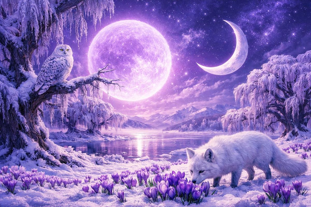 This image showcases a hyper-realistic fantasy scene bathed in shades of purple and lilac. It features a giant sun, snowy willows, a frozen lake, and wildlife under a cosmic sky.