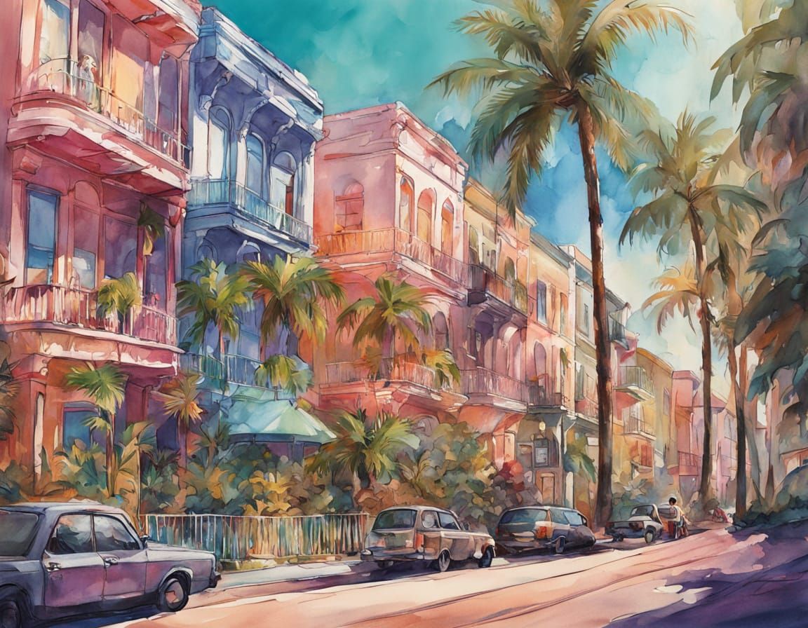 This image shows a colorful South Florida street scene with stucco buildings, lush plants, and palm trees. The sky features psychedelic colors, and a street art mural adds vibrancy. Rendered in a fantasy watercolor style with ethereal, flowing textures.
