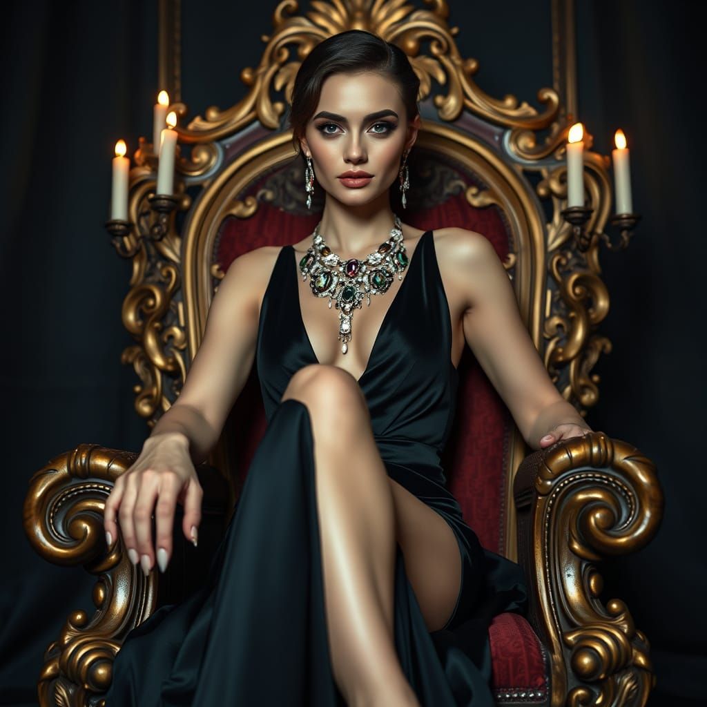 This portrait showcases a stunning woman seated on an ornate throne, wearing a sleek black evening gown with a daring thigh-high slit, surrounded by luxurious velvet, satin, and precious gems, exuding quiet confidence and elegance.