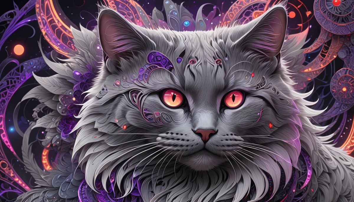 This image shows a tranquil gray cat with striking red eyes and a purple neon aura. The 3D anime art features vibrant fractal patterns and exquisite detail, creating a soothing, idealized aesthetic.