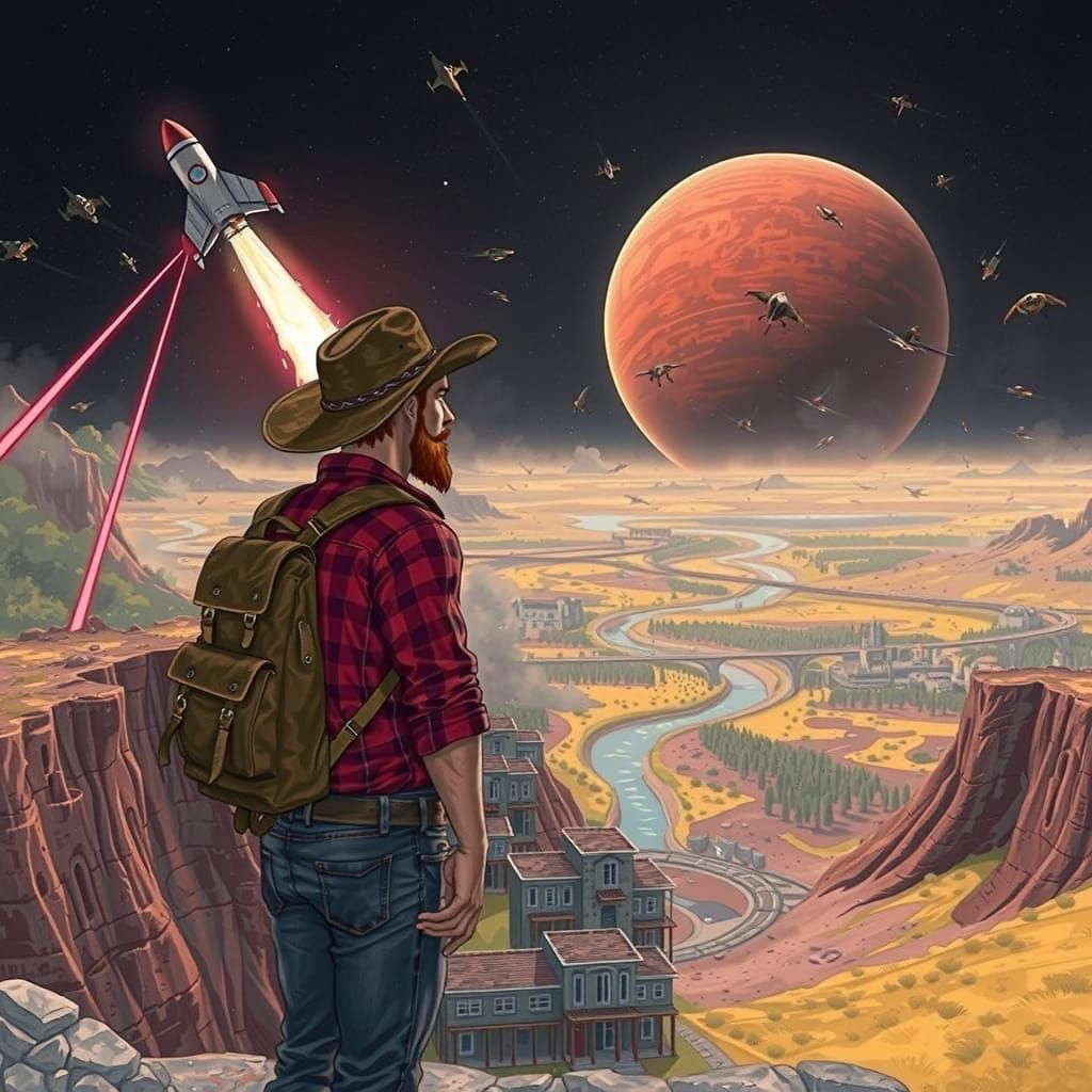 This image shows a rugged, red-haired adventurer standing atop a cliff, gazing out at a ravaged world in a cyberpunk-inspired anime style. A ruined town, rocket ship, and space battle unfold in the background, as the Great Basin landscape burns around him.