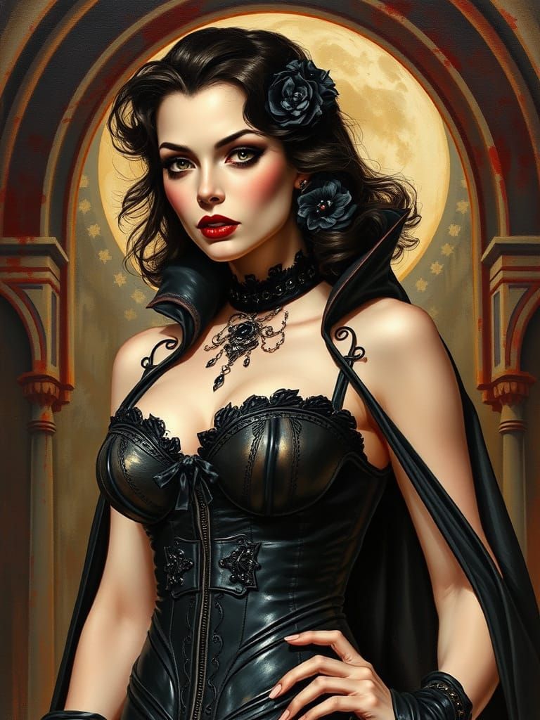 A striking picture of a vampire queen in a leather corset and cape, set against a gothic cathedral. This mixed media pin-up art features alabaster skin and dark eye make-up.