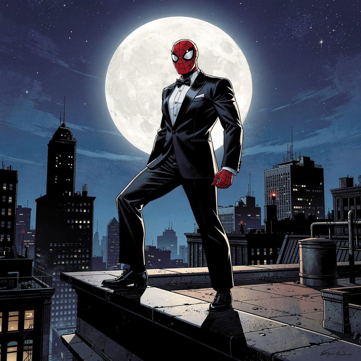 This image shows Spider-Man in a tuxedo, standing under the moonlight. A sophisticated take on the iconic superhero.