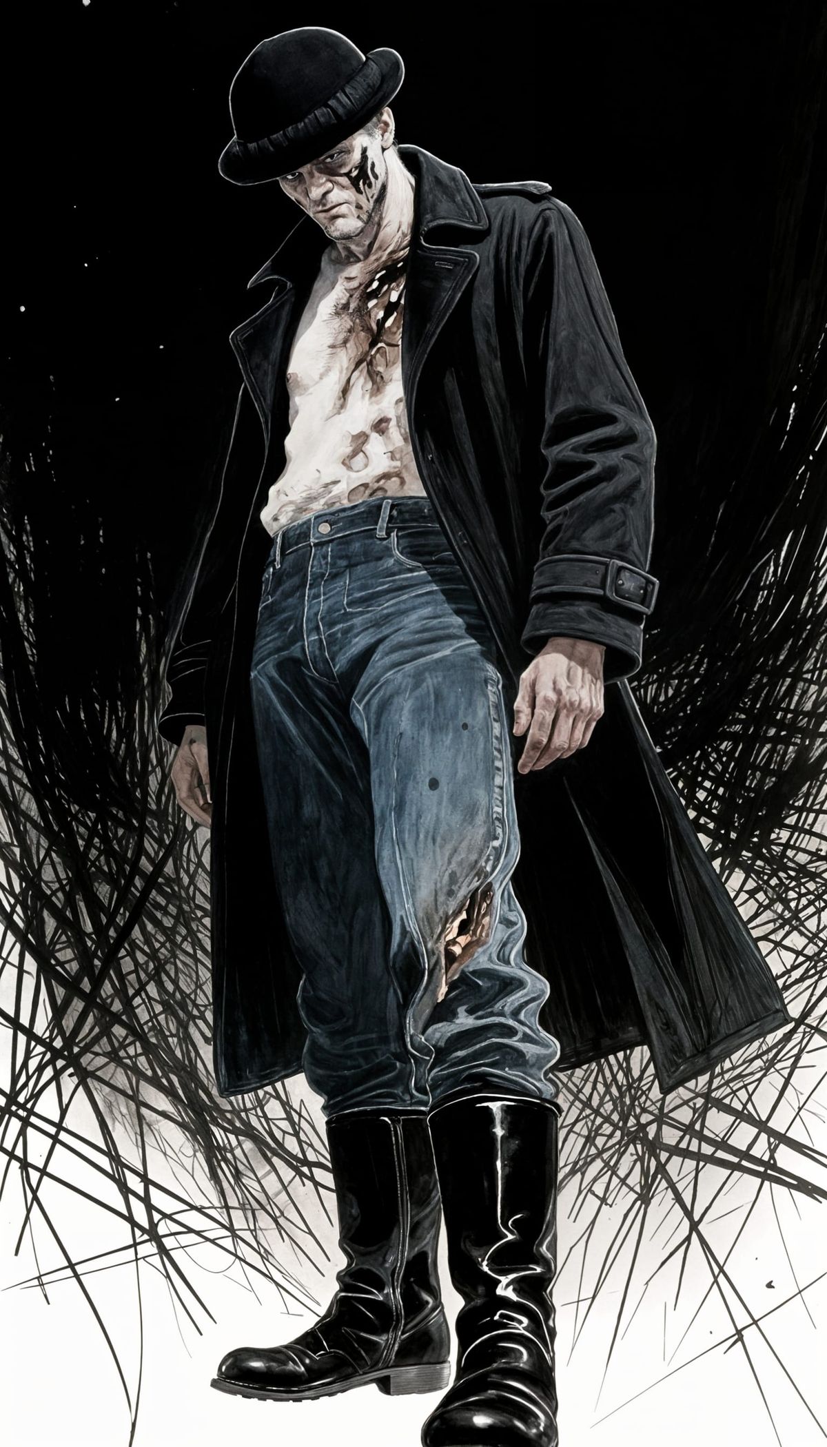 This image shows a man with a burned face, depicted in trembling ink lines and washed watercolors with high contrast lighting. The grim atmosphere is emphasized by the low-angle shot.