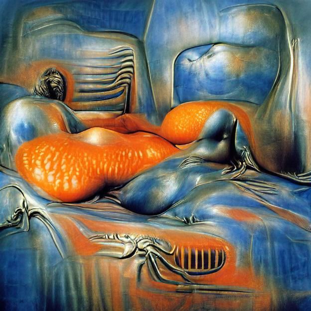 A surreal digital illustration of a large nude woman reclining on a vibrant orange bed. The artwork features biomechanical elements in a surreal and otherworldly style.