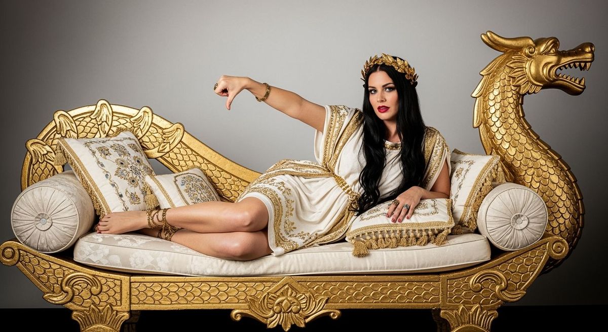 This image shows a Roman Empress in gold and white reclining on a dragon-shaped chaise lounge. She wears a wreath crown and jewelry, with a haughty smile and thumb pointing down. The scene is lit naturally with a bokeh effect.
