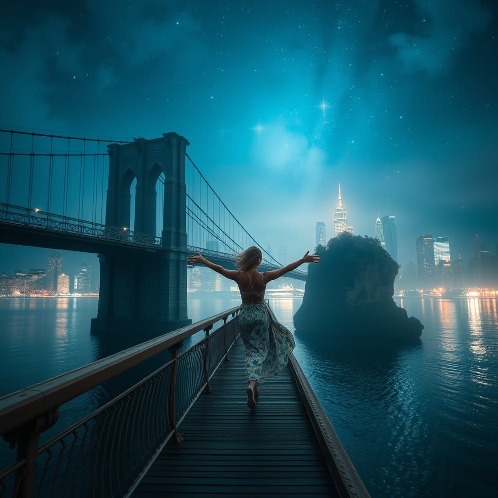 This image captures a serene woman walking on the Brooklyn Bridge, surrounded by a magical atmosphere and suspended between two floating islands in the sky, illuminated by lights above a bright river in a whimsical scene.