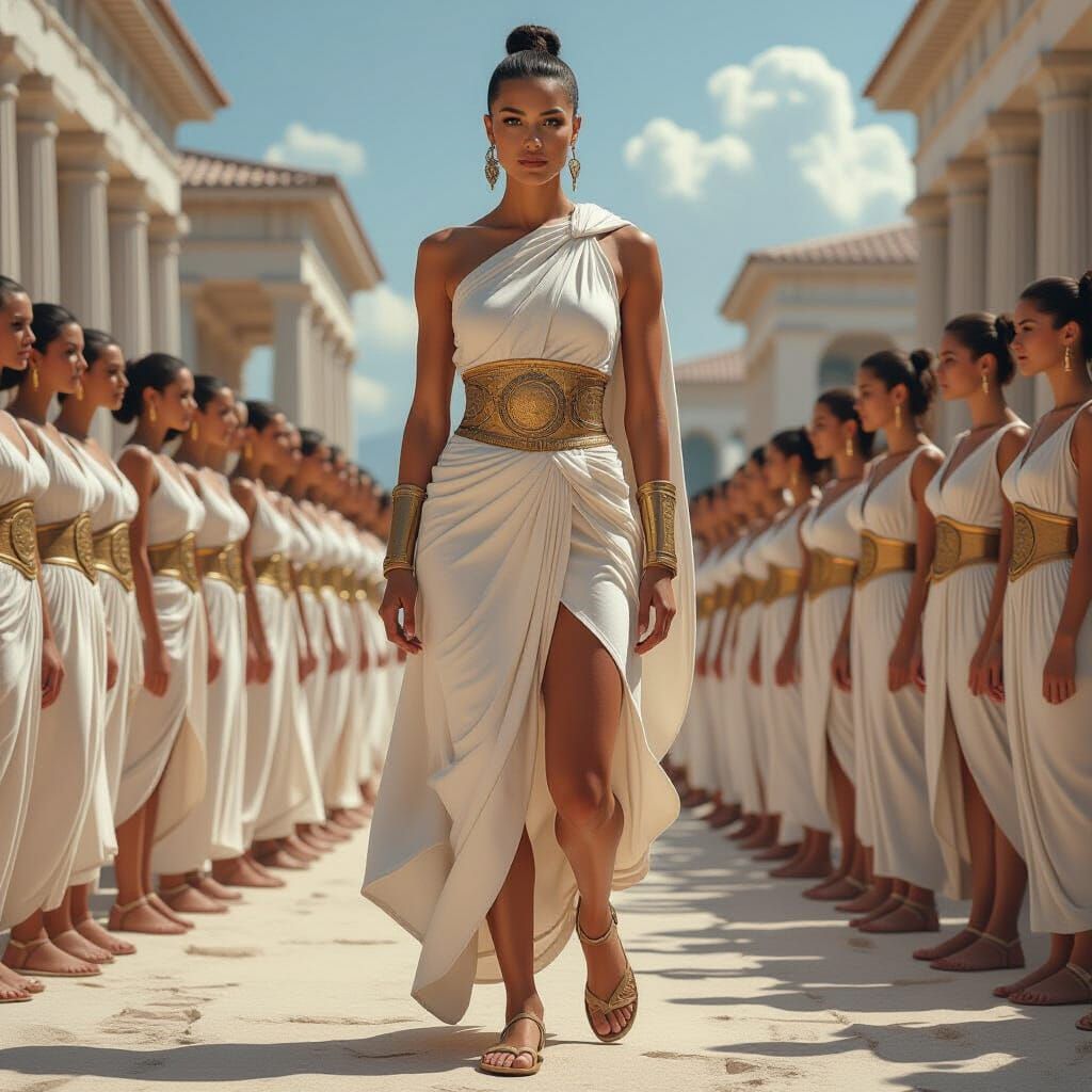 This image shows a bald, athletic woman in golden armor and a white cloak, surrounded by other bald women in tunics and sandals. The scene is rendered with detailed graphics and a complementary color palette.