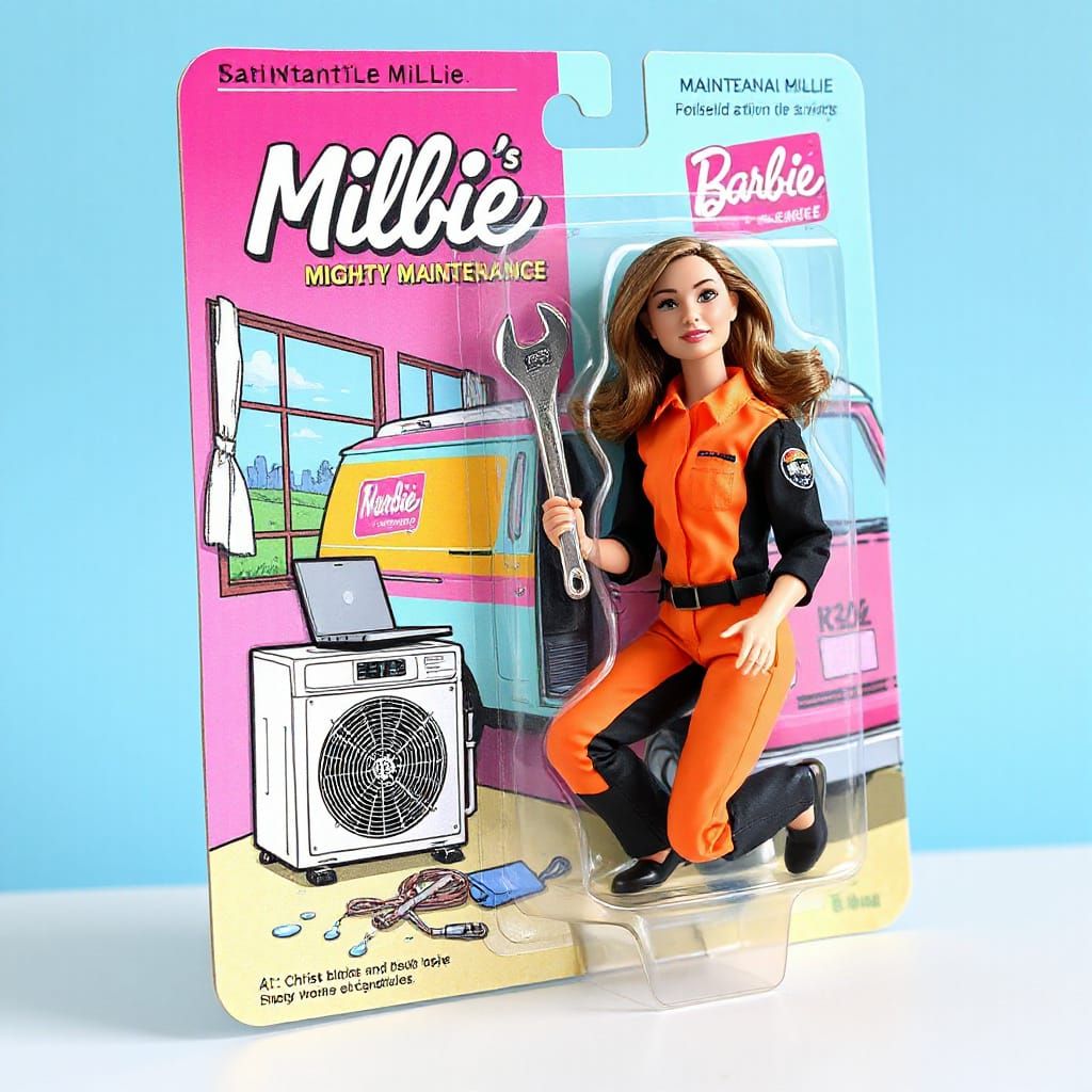 This vibrant collectible action figure box showcases Maintenance Millie in a dynamic pose, surrounded by whimsical illustrations and bold pastel colors, blending elements of detailed artwork and graphic sensibility.