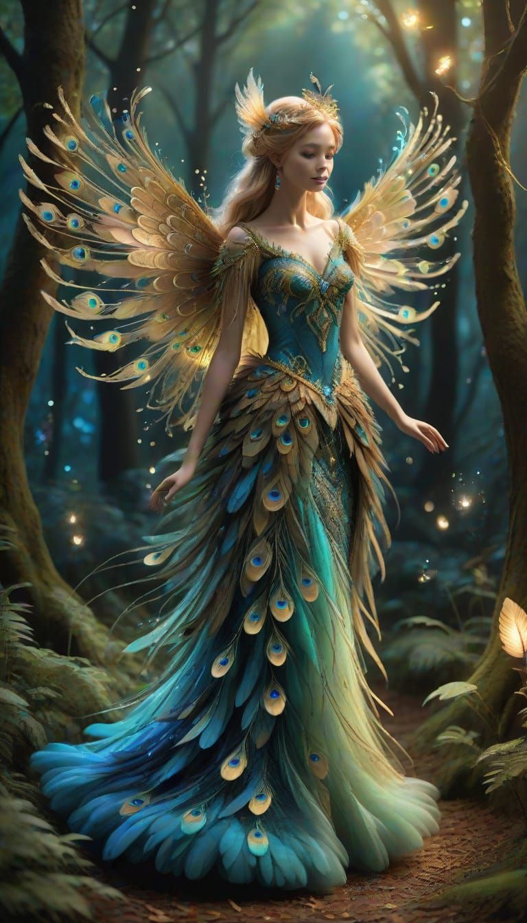 A radiant faerie with golden hair and peacock wings graces an enchanted forest. Her gown is made of feathers, with glowing sparkles and foliage adding to the magical atmosphere.