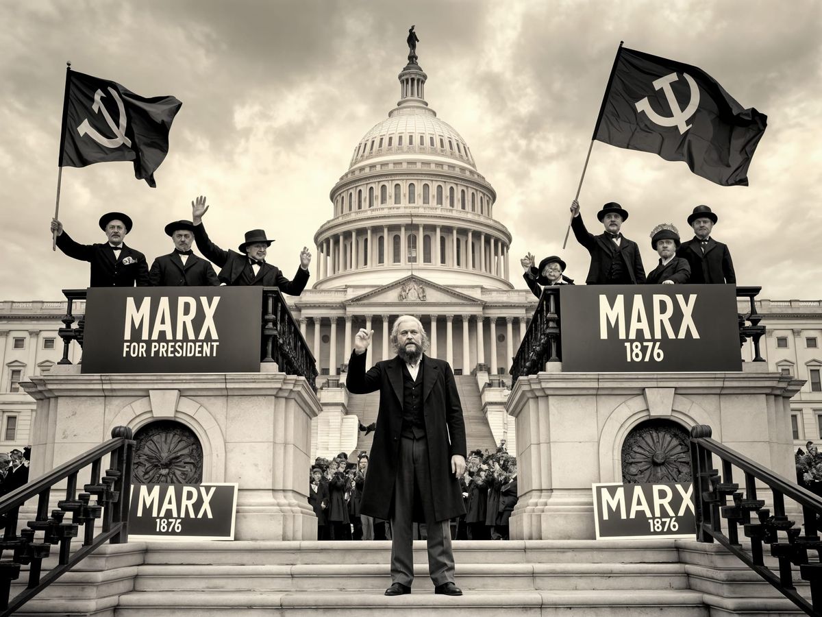 A vintage photograph depicts Karl Marx's fictional inauguration as President of the United States. Communist supporters wave flags in front of The Capitol, creating a cheerful atmosphere.
