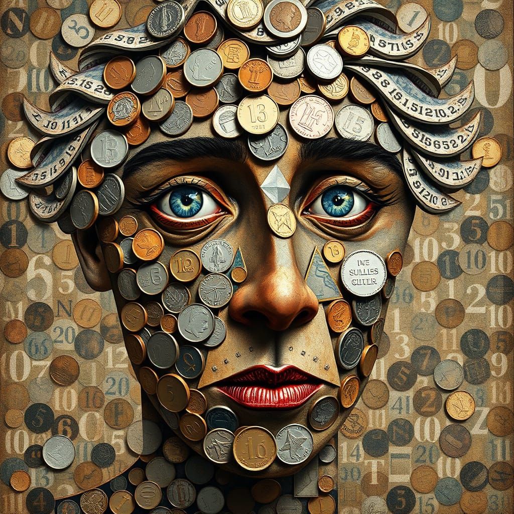 This striking image features a face crafted from a mosaic of weathered coins and paper money, with antique coins for eyes. Rendered in a cubist, hyperrealist style with textured detail.