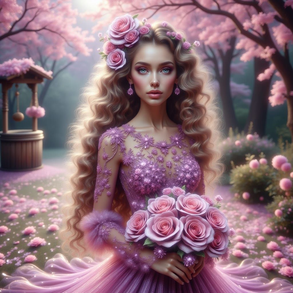 This 3D art portrait features a detailed, full-body image of a woman with long hair in a pink and purple dress, holding flowers near a wishing well.