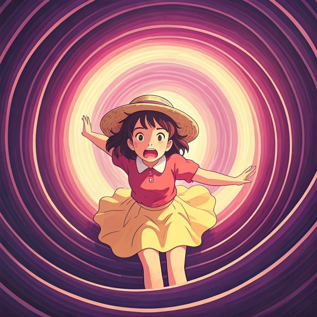 A Studio Ghibli-inspired image of Shizuku Tsukishima sliding down a vibrant purple spiral slide. The artwork is reminiscent of "Whisper of the Heart" with delicate watercolor textures.
