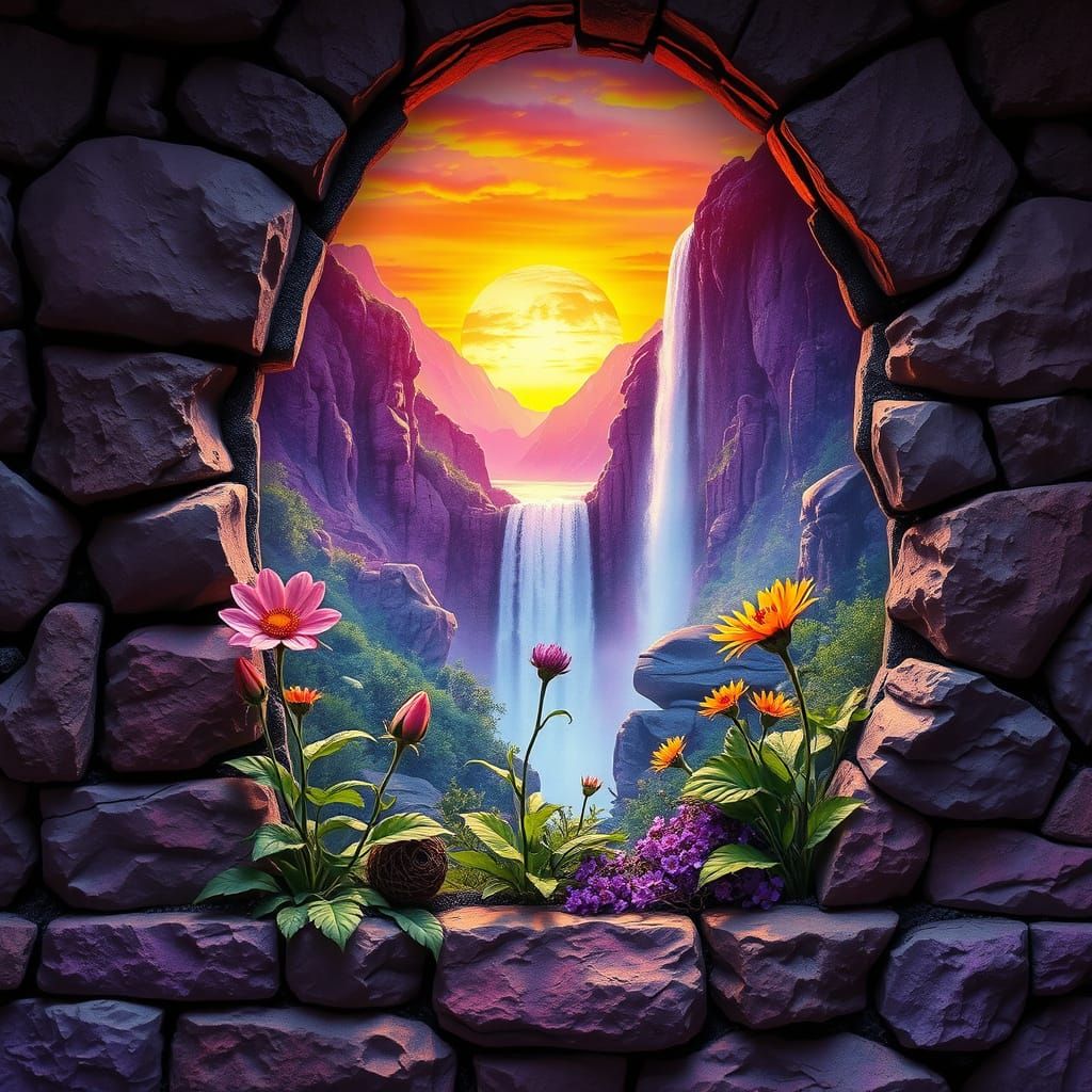 A captivating 3D watercolor illustration of a magical realism landscape on a wall, featuring a stunning sunrise. The foreground is adorned with a variety of flowering plants, including a mystical creeper flower. The wall itself is intricately designed with stones, providing a textured and natural feel. ...