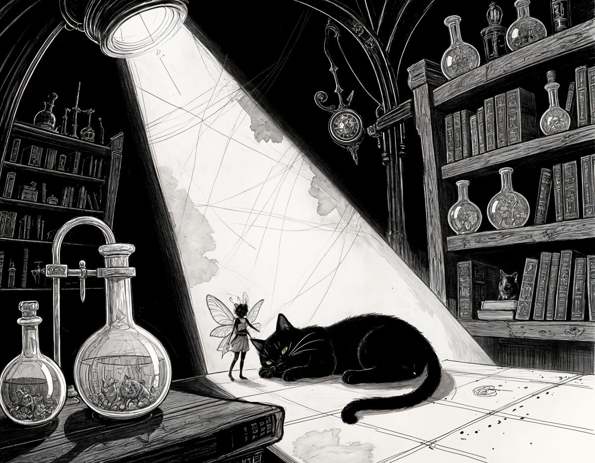 This illustration features a fairy and a sleeping black cat in a grim, magical laboratory, rendered with thin ink lines and watercolor washes for a high-contrast effect.