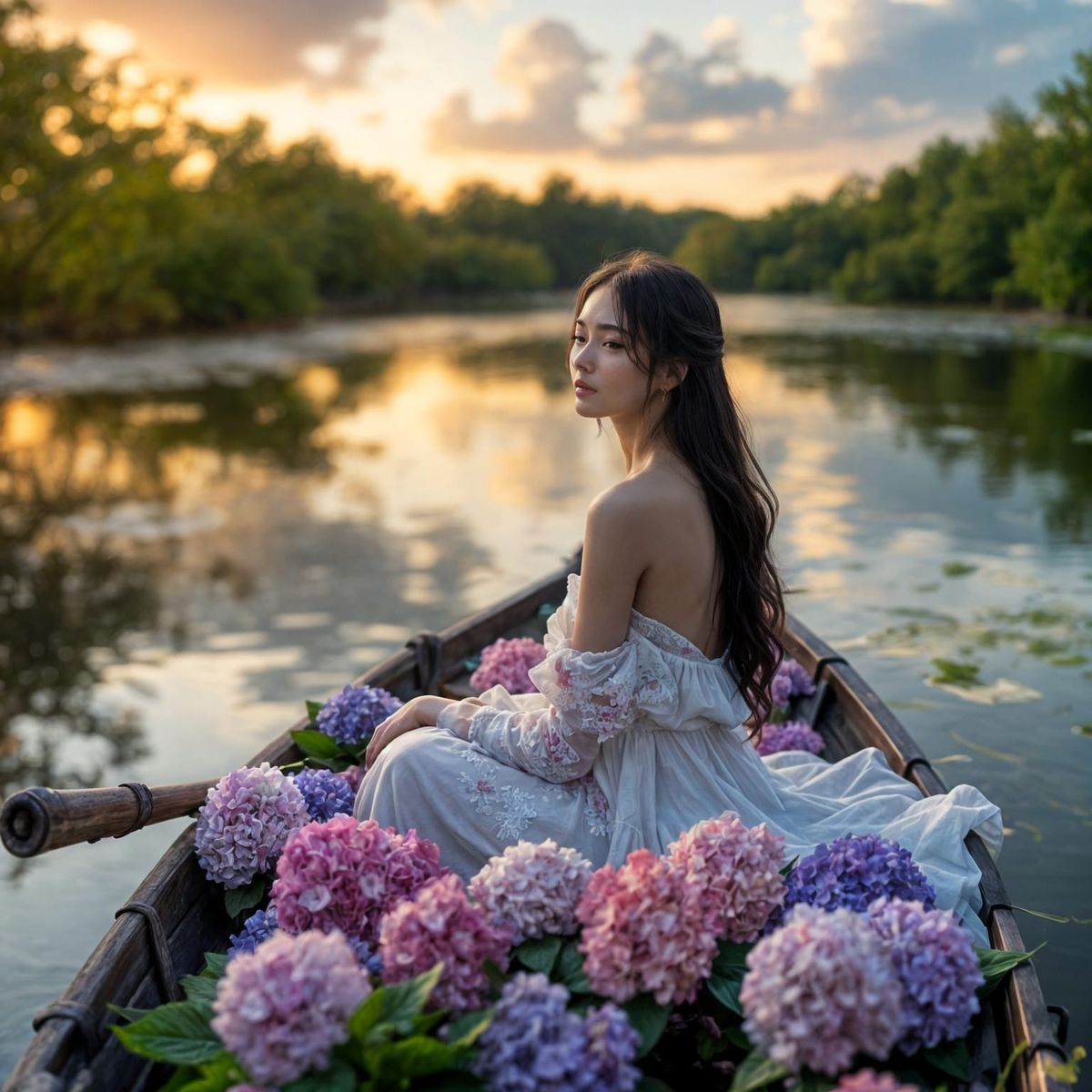 This image shows an Asian woman in a boat filled with hydrangeas on a calm lake at sunset. The soft pastel colors of the sky reflect in the water, creating a peaceful scene.