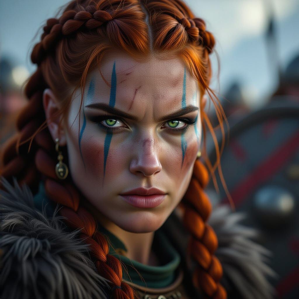 This image shows a fierce Viking warrior woman with red hair and blue face paint, her eyes focused on battle. The background features a blurred shield, rendered in a hyperdetailed dark fantasy concept art style.