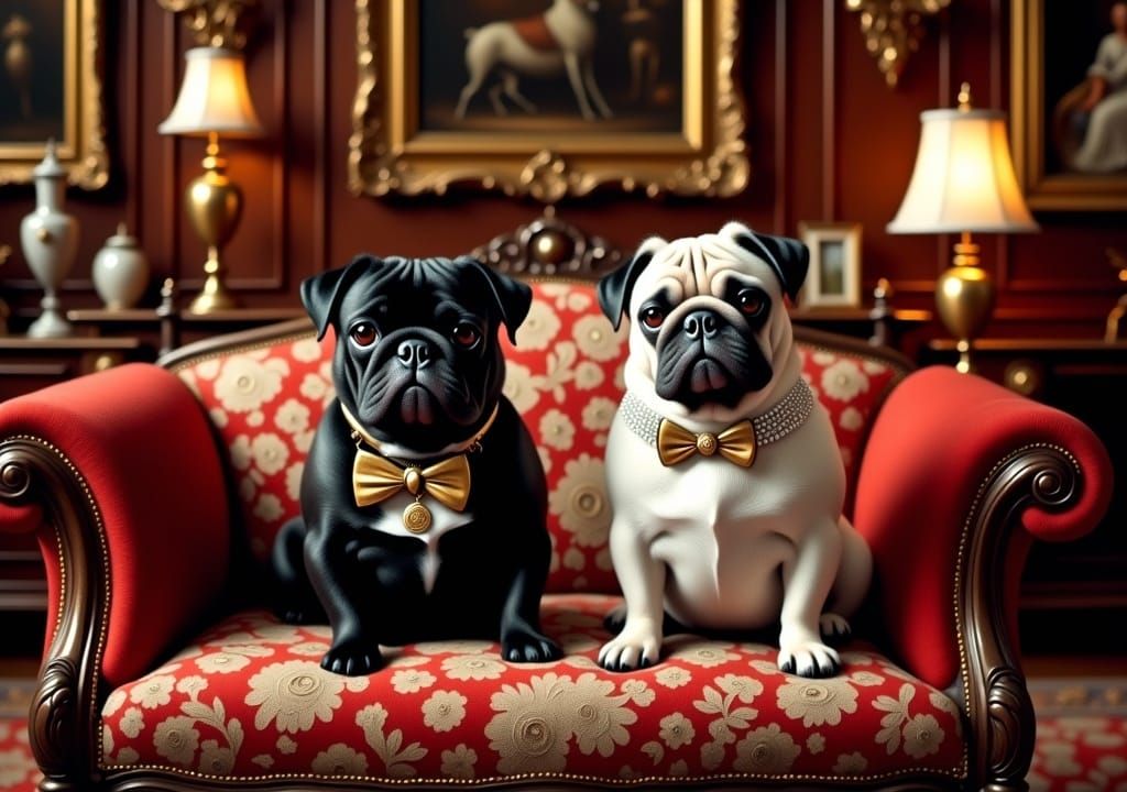 This image shows two pugs in a Victorian steamship state room. The dogs are adorned with steampunk accessories, surrounded by lavish décor and intricate details, with atmospheric lighting and opulent textures.
