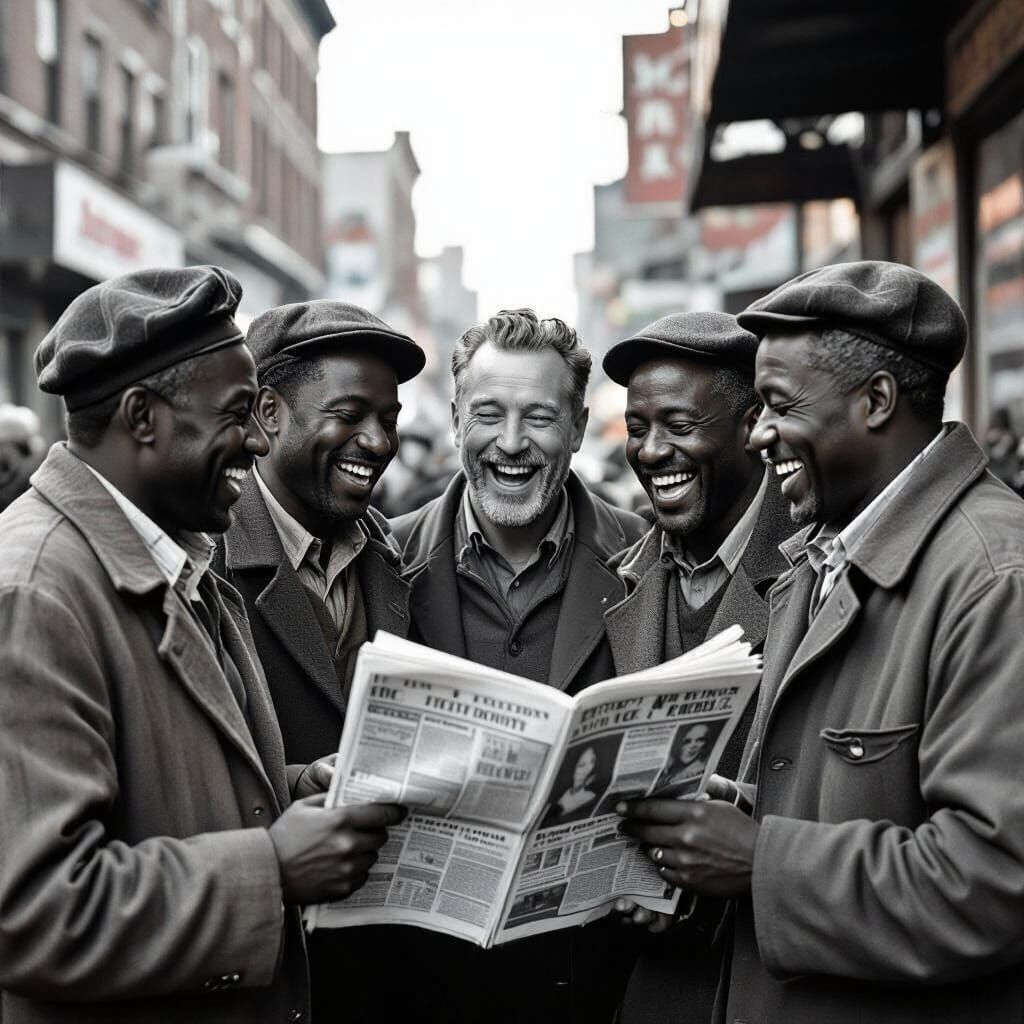 Vintage photograph style. Medium shot. A group of diverse working men in 1950s attire share a laugh over a shared newspaper headline. A subtle hint of political commentary in the headline. Photorealism. Detailed facial expressions showing camaraderie and shared understanding. Gritty urban background. ...