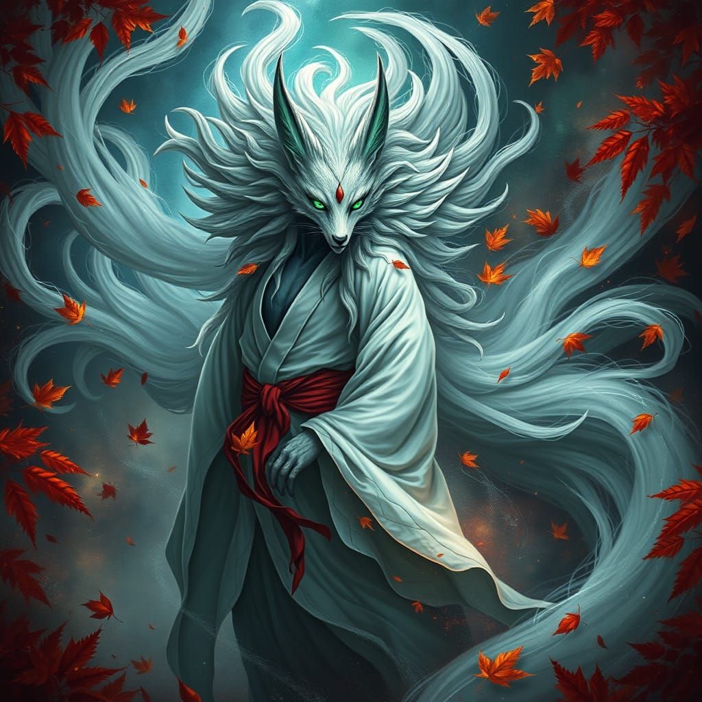 This image shows a mystical nine-tailed fox spirit with emerald eyes and silver hair, in a white kimono. It combines dark fantasy and cyberpunk aesthetics with intricate details and atmospheric lighting.