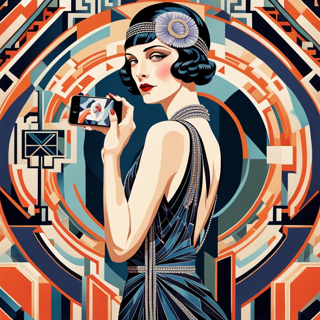 This image shows a flapper holding an iPhone in a medium shot, designed as a vintage 1920s Art Deco advertisement. The artwork features bold colors, geometric patterns, and intricate typography.