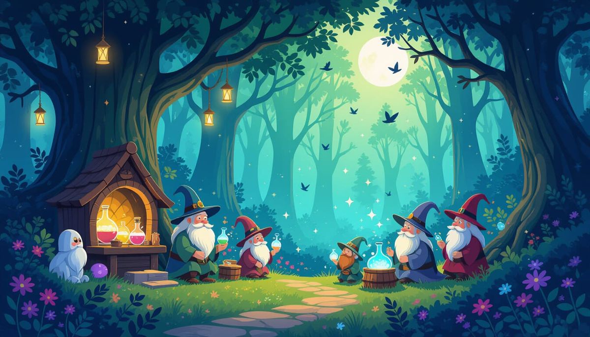This image shows a whimsical, enchanted forest where fantastical creatures provide magical services such as potion brewing and spell casting, illustrated in a detailed storybook style with vibrant, glowing colors.