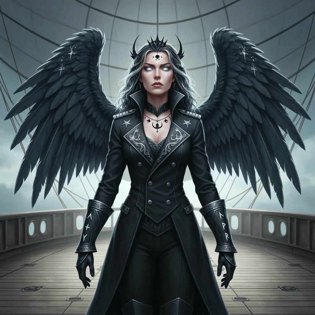This detailed fantasy art depicts a regal Aasimar female airship captain on the U.S.S. NYMWRIS. She commands with divine authority, her ethereal wings and ornate attire highlighted by dramatic cinematic lighting.