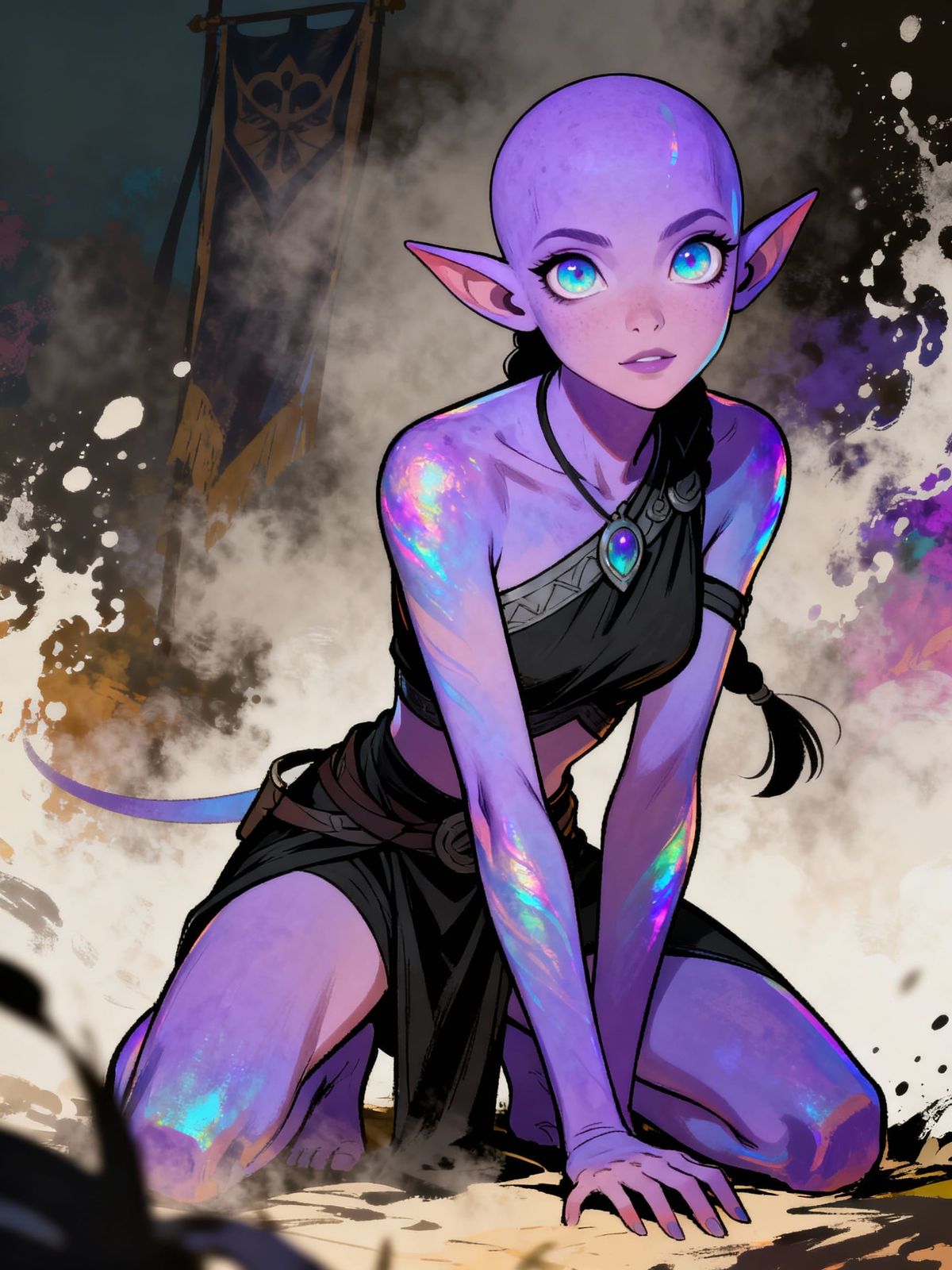 medium distance, ultra wide-angle, storytelling, full body portrait of Banner Saga artwork:: rich colors, dynamic pose, 8k Resolution, black line art, sharp details :: cel shaded, close-up portrait of beautiful, bald, enchanting, young lavender gradient female goblin with stunning large limpid eyes, ...