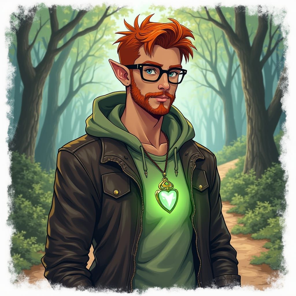 This image features a stylized illustration of a confident half-elven man with auburn hair, set against a textured pastel chalk art background of a winding forest path, with vibrant colors and subtle shading reminiscent of fantastical world art.