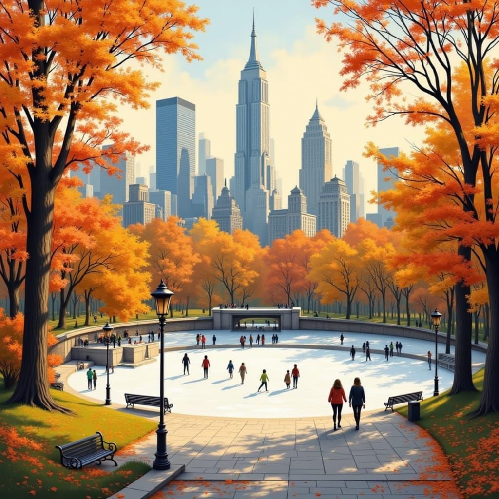 This image shows a detailed digital painting of an autumn city park with golden foliage, an ice skating rink, and skyscrapers. The scene features fallen leaves, lampposts, and soft afternoon light.
