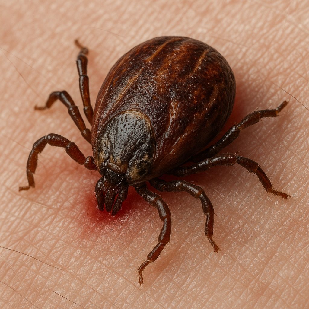 This image shows a highly detailed, photorealistic close-up of a wood tick embedded in human skin. The image highlights the need for vigilance regarding these common pests.