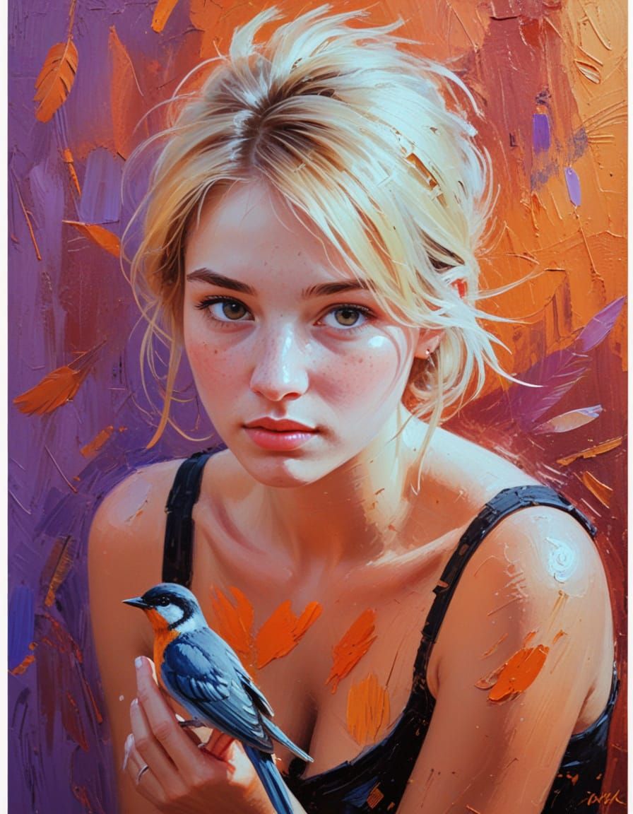 A striking portrait depicts a teenager with a small bird on her finger. The image is rendered as a textured impasto painting with vibrant, bold colors and expressive brushstrokes.