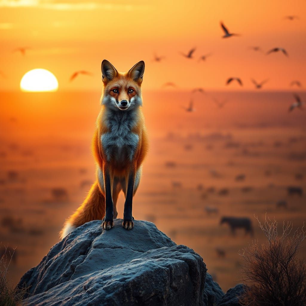 A hyperrealistic image of a fox standing on rocks, gazing over an African savanna at sunset. Birds fly in the distance, with shallow depth of field and a bokeh effect.