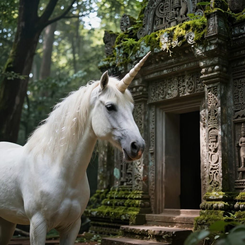 This hyperrealistic image shows a white unicorn with a shimmering mane before an ancient, moss-covered stone temple. Dappled sunlight filters through the forest canopy, highlighting intricate carvings.
