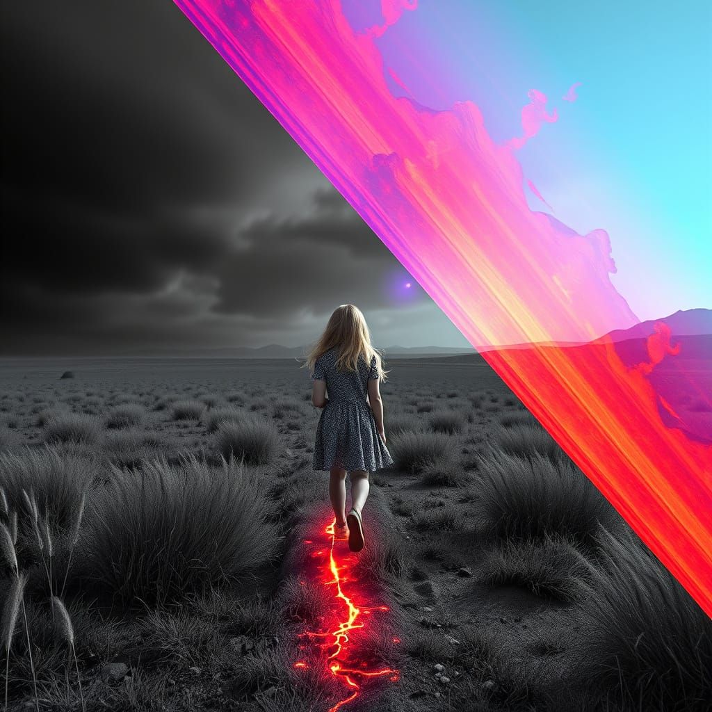 This image shows a girl with blonde hair walking through a landscape and painting with a brush. The monochrome environment transforms into vivid color with her footsteps, creating a magical boundary in futuristic realism.