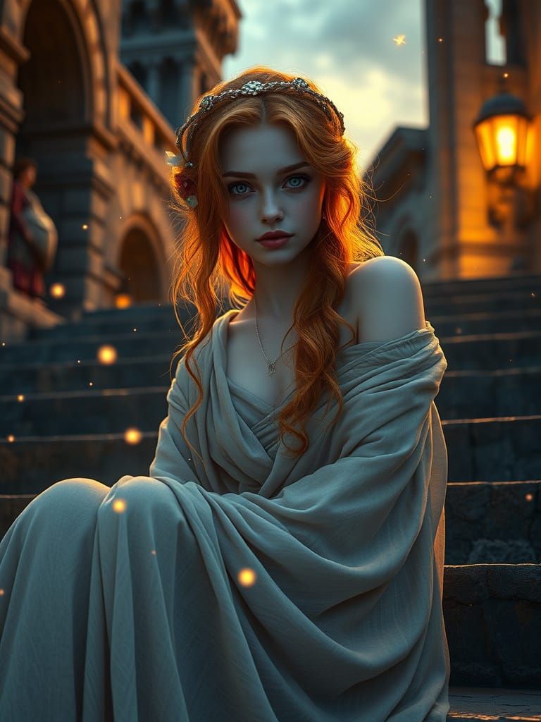 A hyperrealistic fantasy art portrait of a woman with delicate features and ginger hair on ancient steps. Ethereal particles and cinematic lighting create an astral atmosphere. Photorealistic 8k.