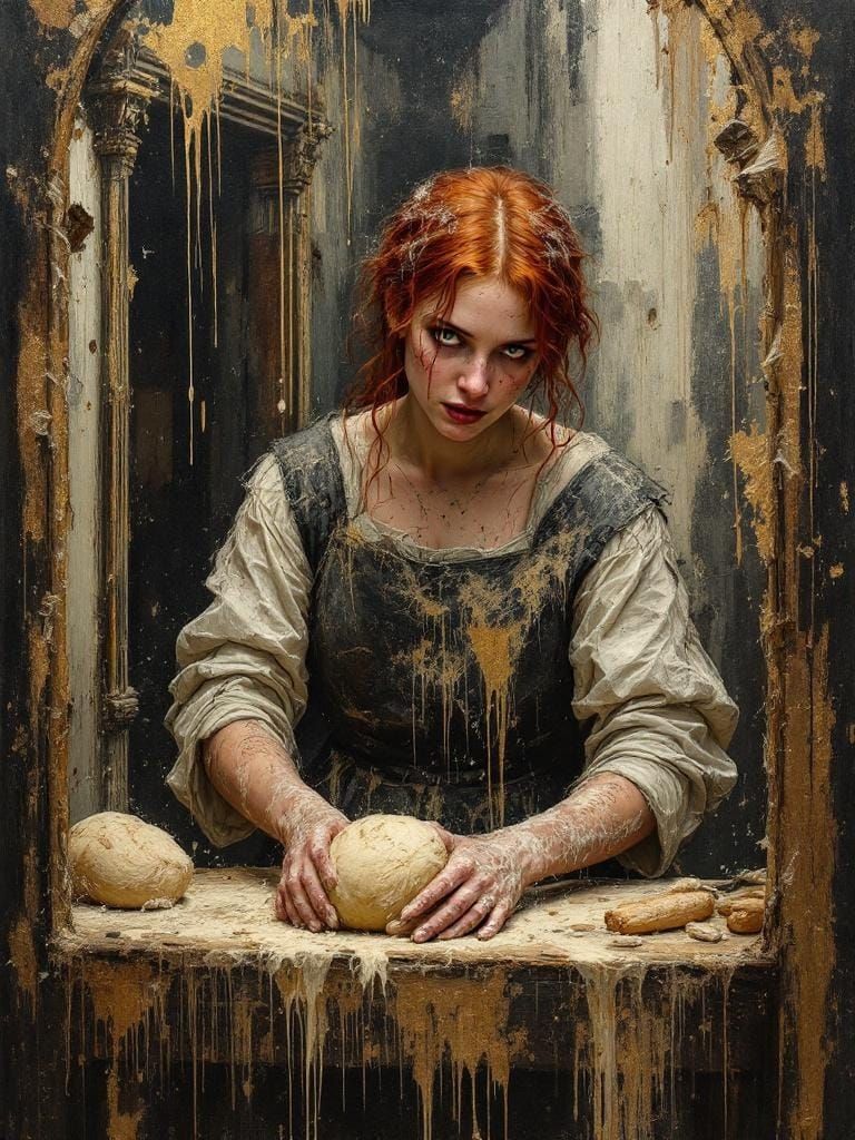 This image shows a 1500s redhead baker glancing shyly at the viewer, flour on her face and apron, kneading dough in a bustling kitchen. The image blends elements of medieval manuscript illumination with decaying architectural and flesh textures.