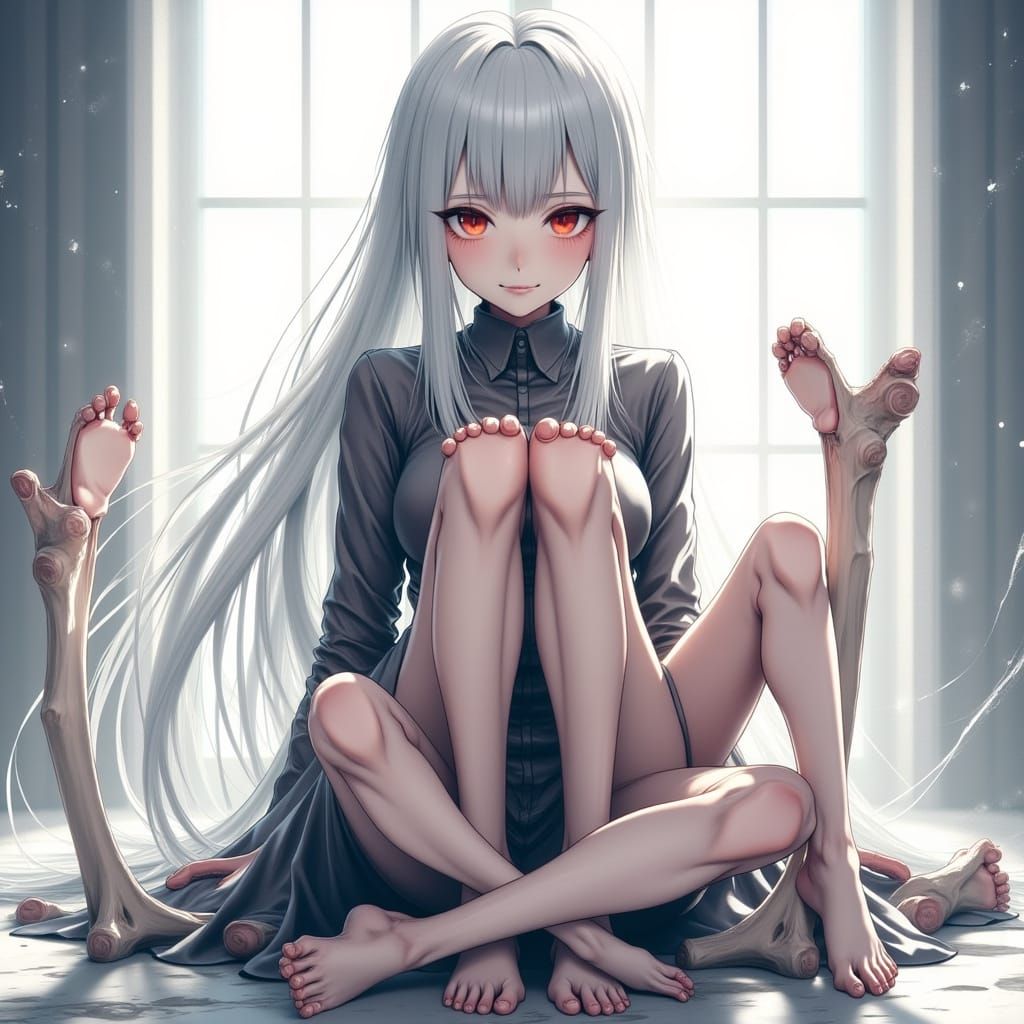 This image shows an anime-style woman with white hair and an unusual anatomy. She has four legs, two folded beneath her and two positioned on either side of her hips.