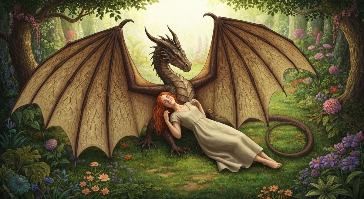 This image shows a red-haired woman resting peacefully next to a colossal dragon in a vibrant garden. The dragon protectively shields her with its wings, in a botanical art style.