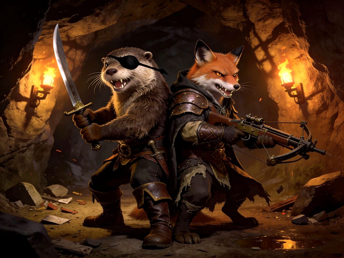 A fantasy adventure scene of a sea otter pirate and a fox assassin standing defensively back to back as they prepare to fight an unseen enemy. The otter wears an eye patch, high boots and holds a cutlass sword. The fox wears a leather pauldron underneath a cloak and holds a medieval crossbow weapon. ...