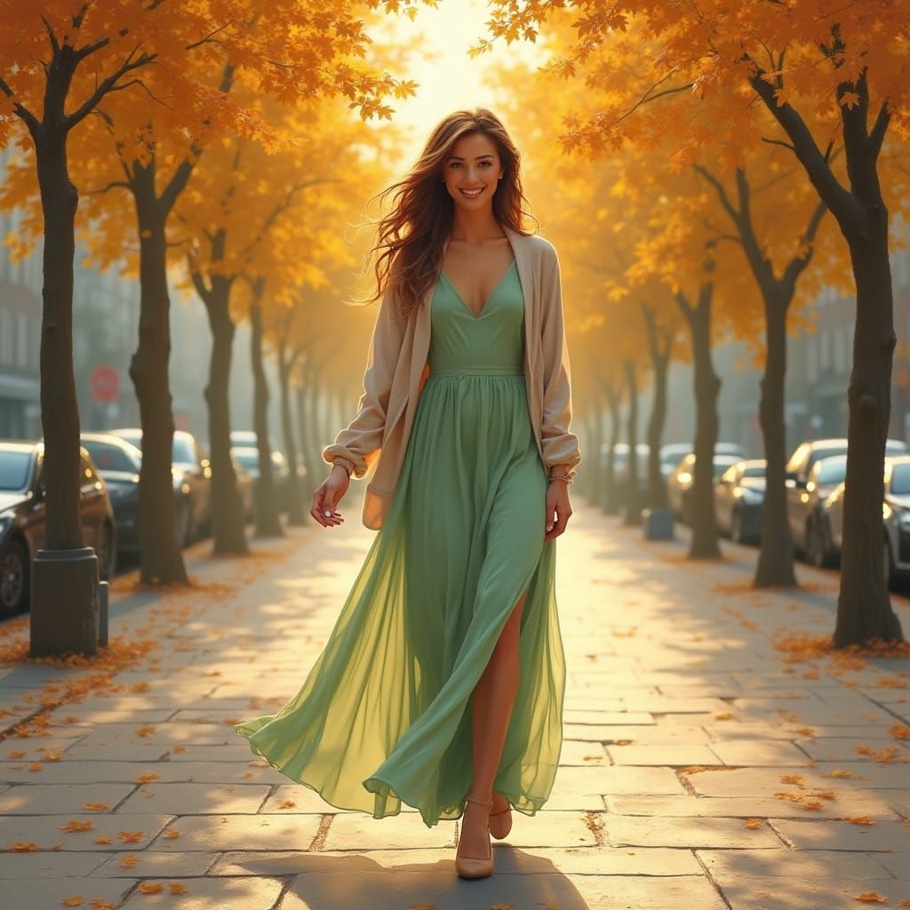 A smiling woman in a flowing green dress and cardigan walks an autumn avenue bathed in golden hour light. Rendered in a romantic, painterly style with soft colors and visible brushstrokes.