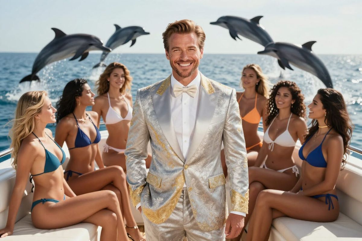 An accomplished, successful, rich, happy and smiling man in a formal, beautiful silver and gold suit, is on his luxury boat, which is filled with his wonderful companions, beautiful young women in bikinis. In the background, beautiful dolphins jump out of the water. All together are illuminated by the wonderful divine light.