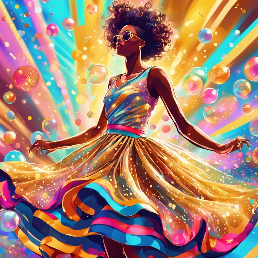 A glamorous woman in a sparkling bubble dress dances in vibrant pop art style. This digital fashion illustration features bright colors and golden lighting.