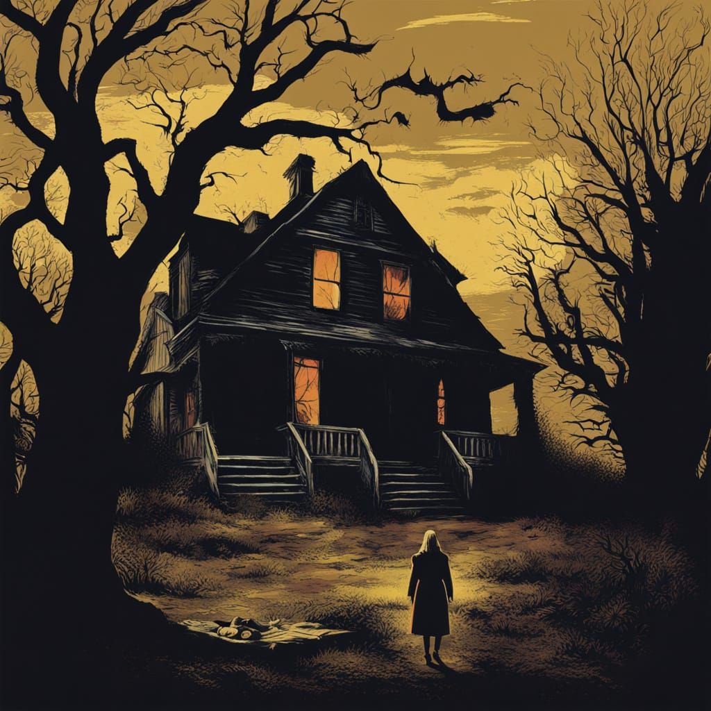 This image depicts a mysterious woman standing on a moor at twilight. Twisted trees and ancient stones surround her in a scene reminiscent of a 1970s horror movie poster with a dark fantasy aesthetic.